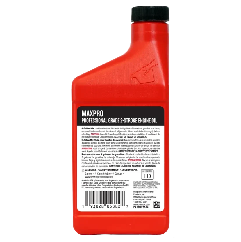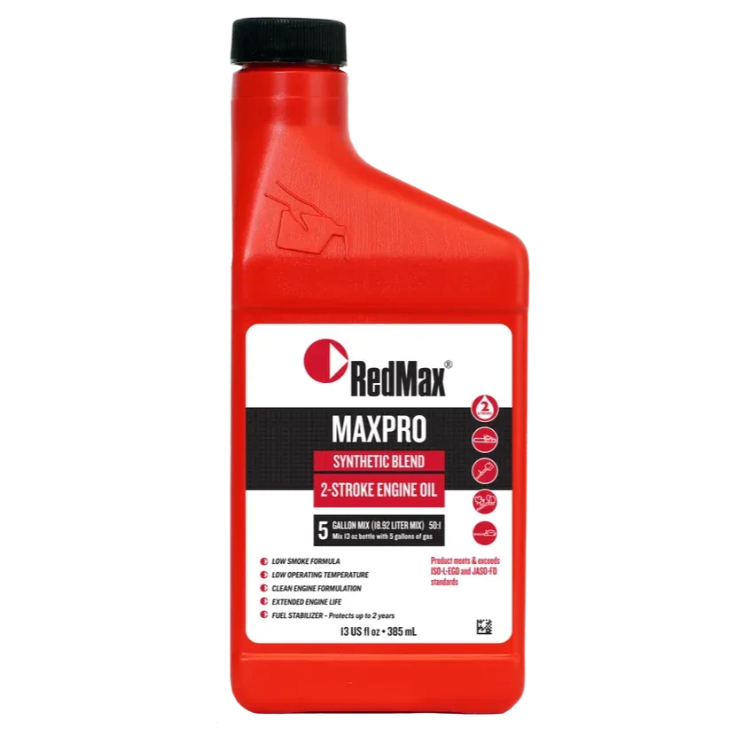 MAXPRO 2-Stroke oil is engineered for top-tier performance, specifically designed and tested for RedMax 2-stroke engines. Certified JASO-FD, MAXPRO meets and exceeds the toughest oil standards, ensuring optimal engine lubricity, excellent detergency, and minimal exhaust output. The low operating temperature keeps engines cooler, promoting easier starts and extended engine life. Its superior detergency reduces deposits, keeping engine components cleaner and minimizing the risk of ring sticking. MAXPRO also includes a fuel stabilizer to prevent fuel breakdown, even with ethanol-blended fuels.